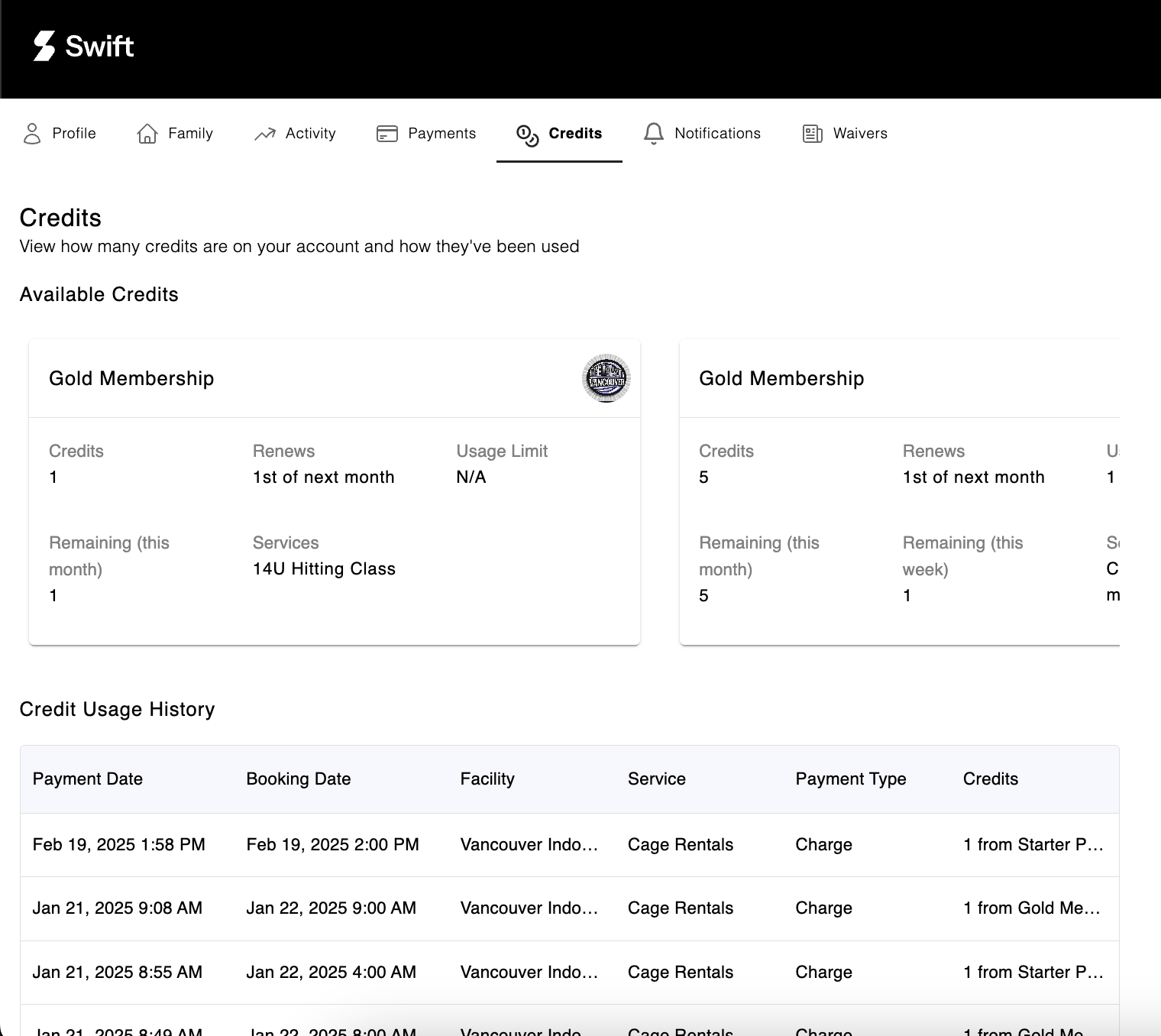 If you have a membership or package at a facility that includes credits for specific services, you can easily track them in your account under the Credits tab.