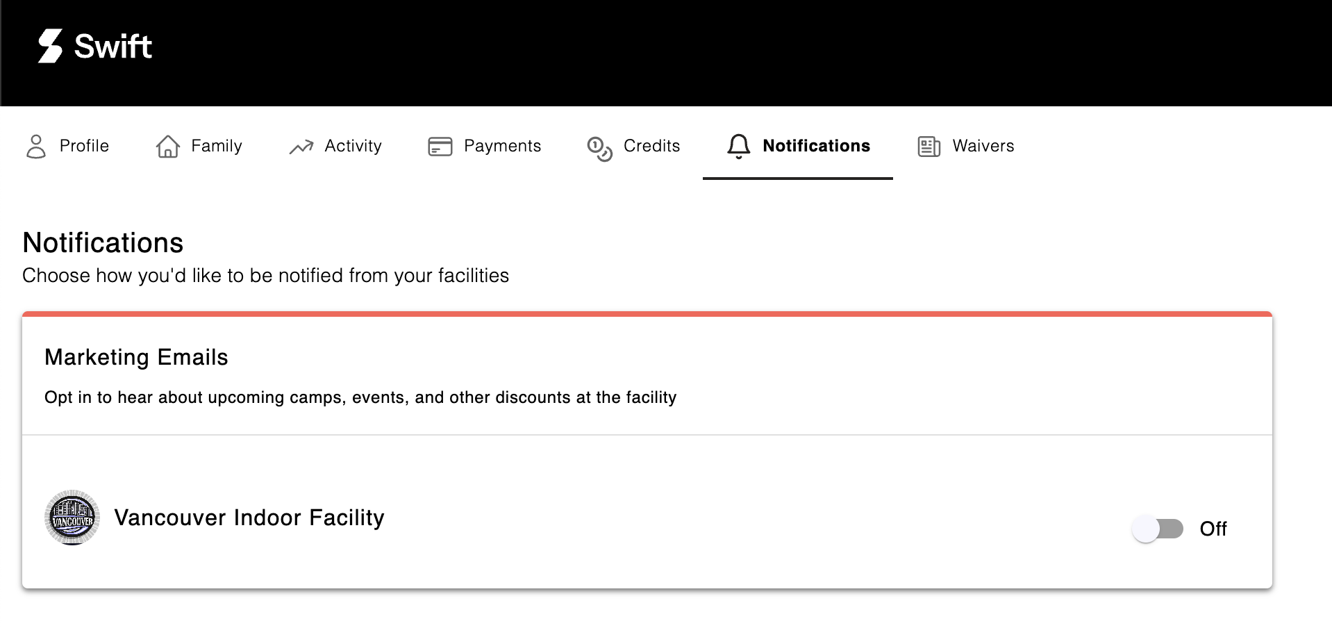The Notifications tab allows you to control your preferences for receiving marketing updates from a facility.